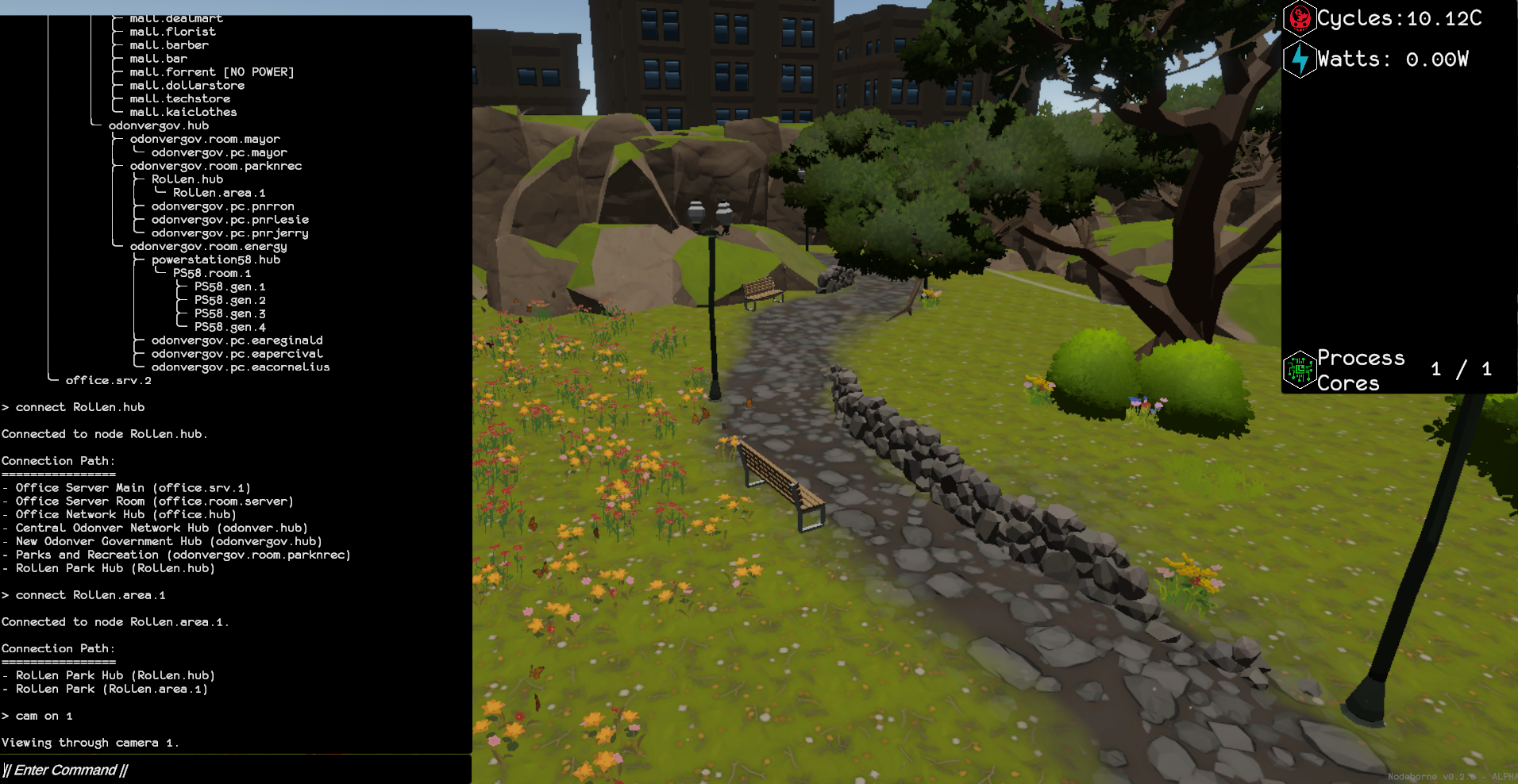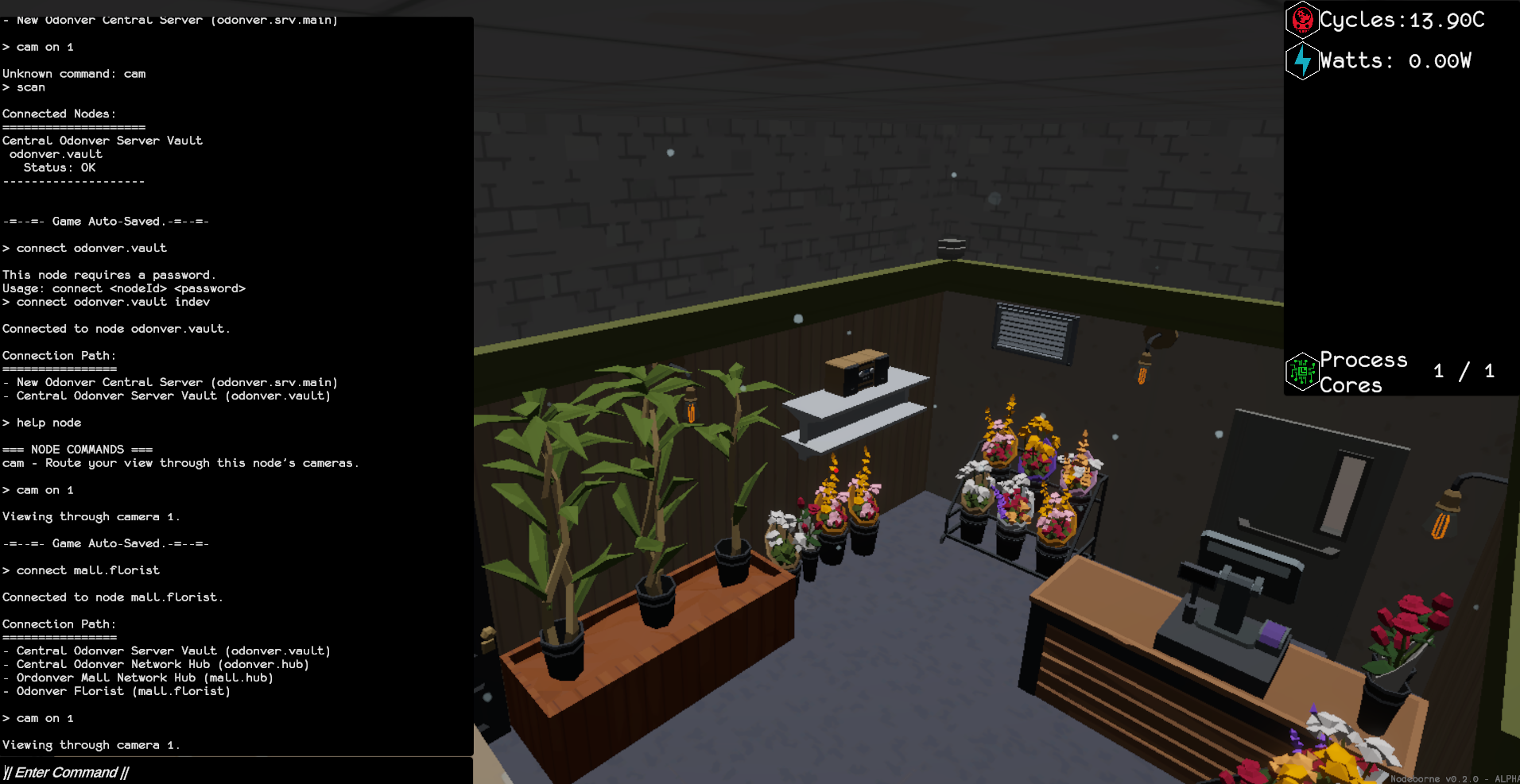 I know using terminal can bring a hacking/retro/matrix vibe (or nostalagia? I am quite young so idk) but despite you get used to the commands as you play, I wonder if unlocking some buttons (or new commands? Like auto-setting best cycles process) to do some complex task (like changing node processing, currently you must connect, stop, connect, start) could add some QoL. That can fit with the story: I guess commands becomes natural for that AI as it's its life. Plus if you still see all the primary commands of the complex task being quickly executed in the terminal it may bring to the player a feeling of becoming a stronger AI, like you're doing bigger and harder computer things